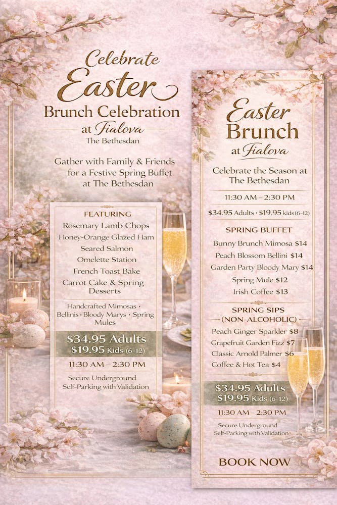 Celebrate Easter at Fialova at with a festive spring buffet featuring carved honey-orange glazed ham, rosemary lamb chops, seared salmon, made-to-order omelets, French toast bake, fresh salads, and classic carrot cake.